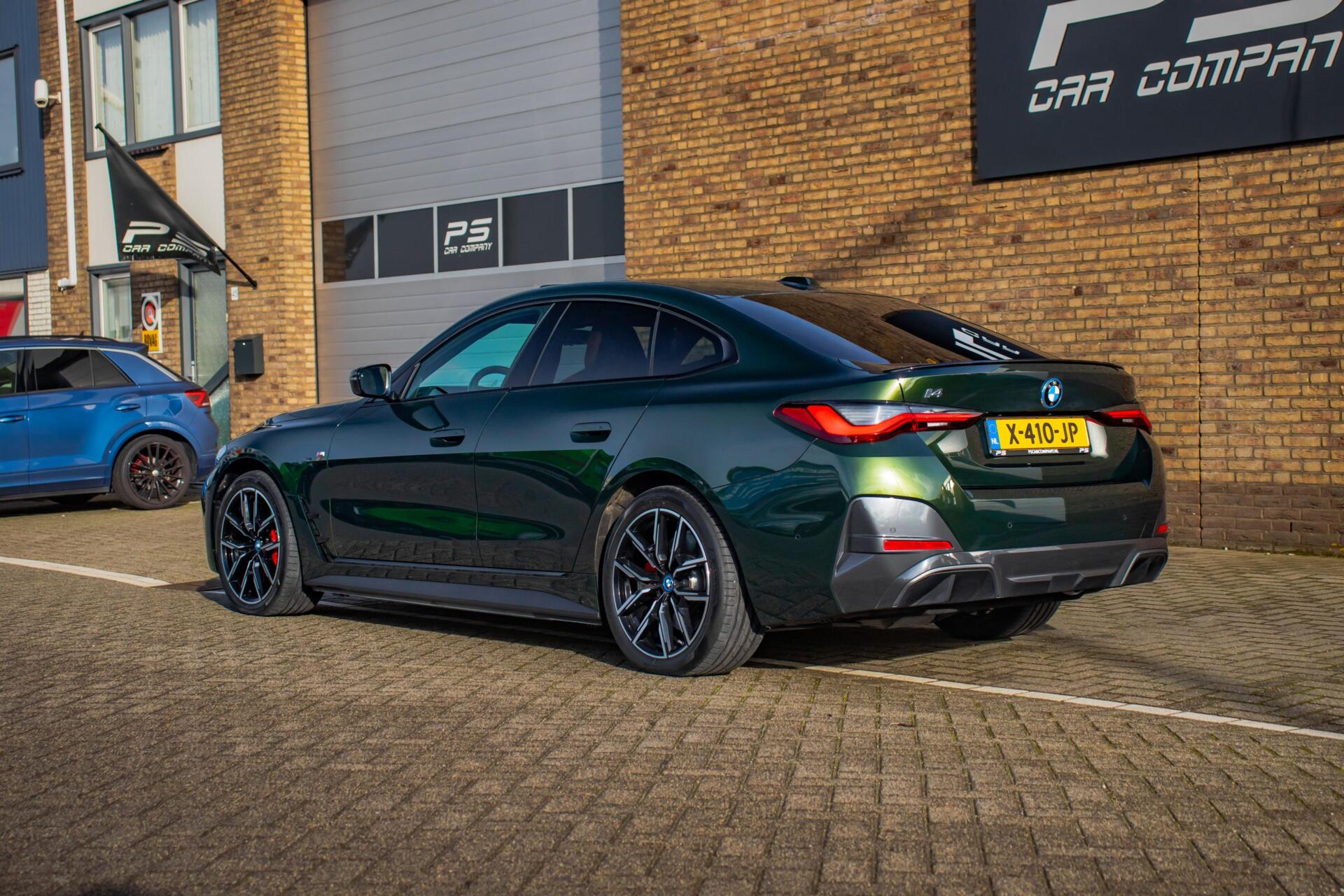 De i4 presenteert zich in de verfijnde kleur San Remo Groen metallic – een zeldzame tint die prachtig contrasteert met de 19 inch lichtmetalen velgen en de strakke coupé-lijnen van het Gran Coupé-silhouet. De panoramische glasdakconstructie zorgt voor een ruimtelijk gevoel, terwijl de subtiele blauwe accenten het elektrische karakter van de auto benadrukken. Het resultaat is een sportieve en tegelijk elegante verschijning die opvalt zonder te overdrijven.