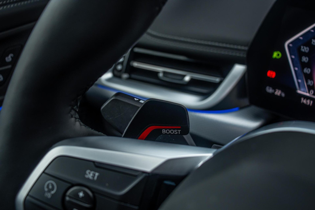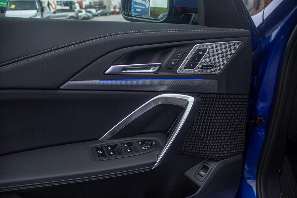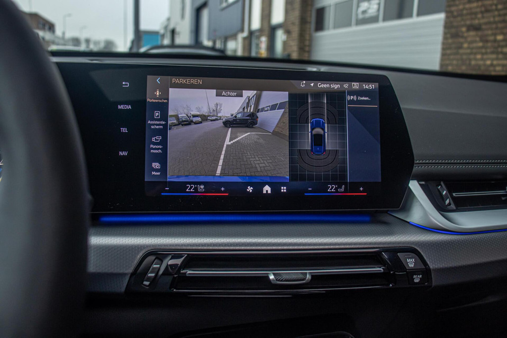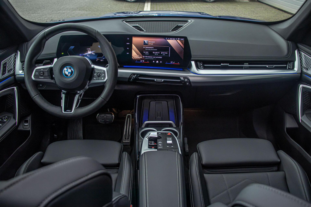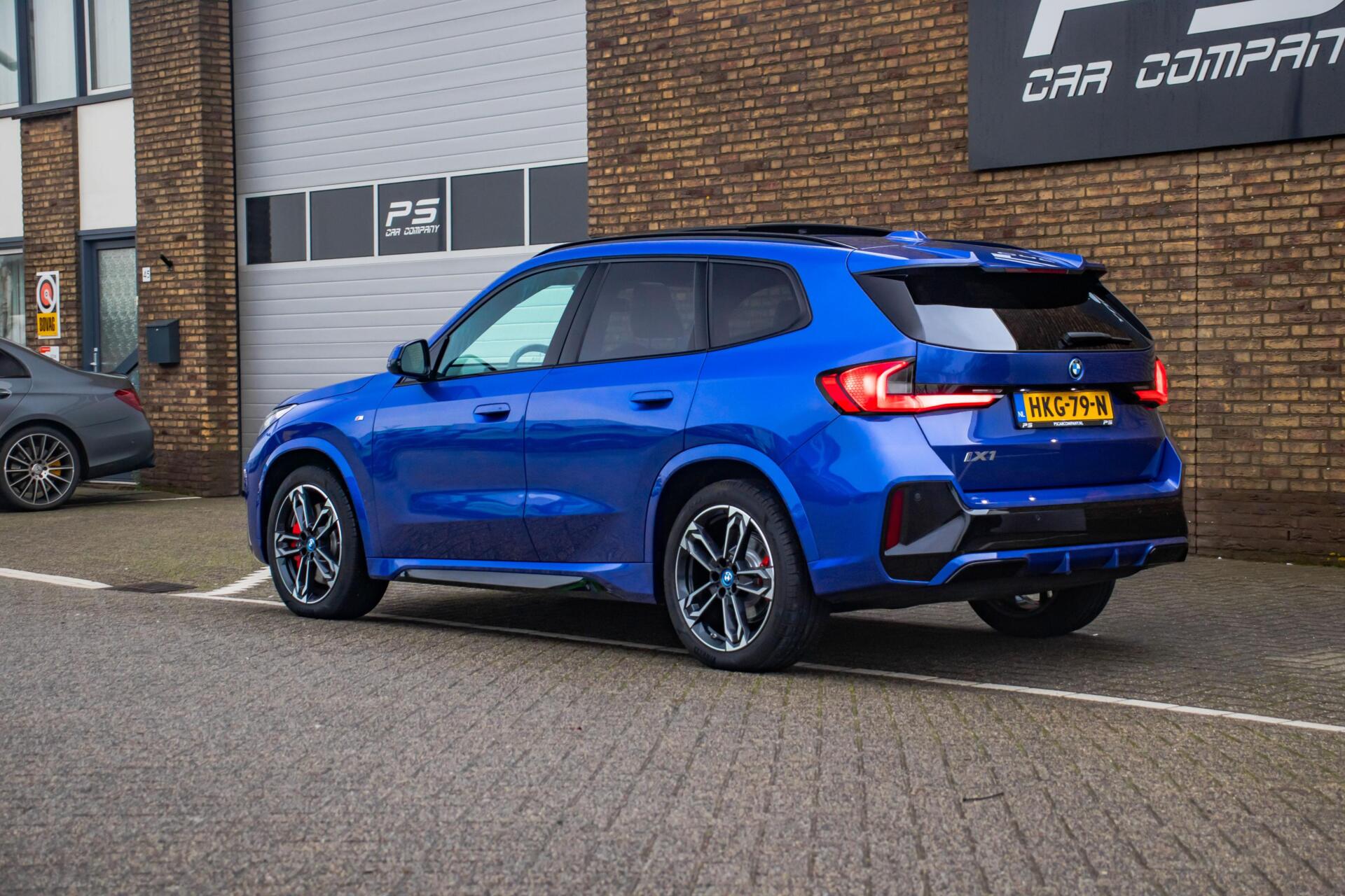 De auto is uitgevoerd in het stijlvolle Portimao Blue, een kleur die perfect past bij het moderne design van de iX1. In combinatie met de 19 inch lichtmetalen wielen krijgt de auto een krachtige en sportieve uitstraling. Het panoramadak maakt het exterieur helemaal af en geeft bovendien een ruimtelijk gevoel in het interieur.