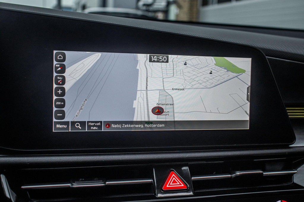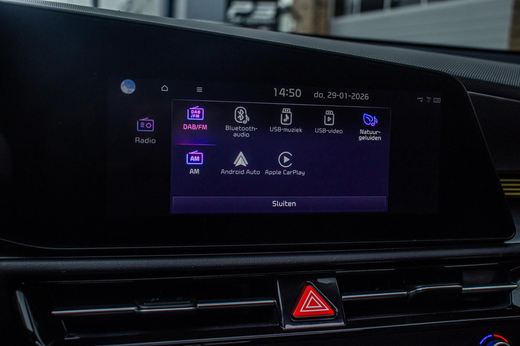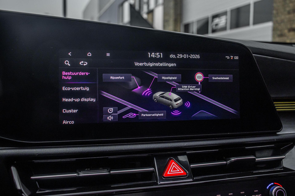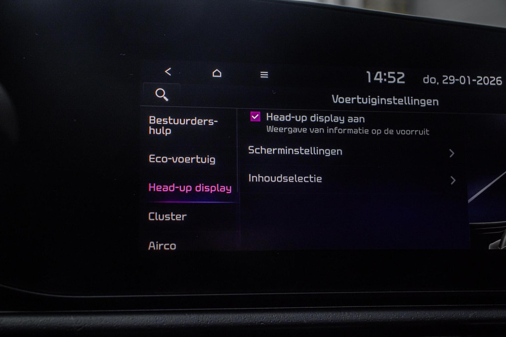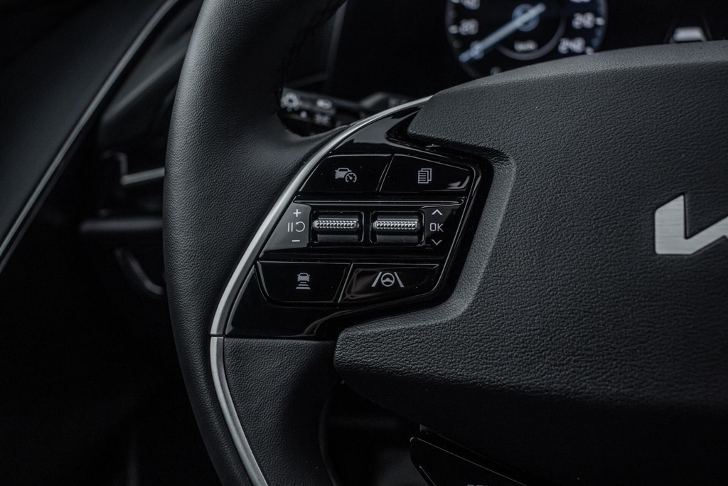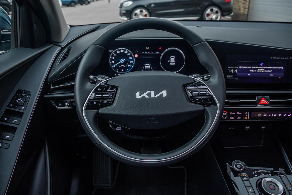 Binnenin biedt de Kia Niro een comfortabel en hoogwaardig interieur. De lederen bekleding zorgt voor een luxe sfeer, terwijl zowel stoel- als stuurverwarming het comfort verhogen tijdens koude dagen. Het head-up display projecteert belangrijke rij-informatie in het zichtveld, wat bijdraagt aan veiligheid en rust tijdens het rijden. Verder is de auto uitgerust met climate control, Apple CarPlay en een overzichtelijke parkeercamera. Systemen zoals adaptieve cruise control en dodehoekdetectie maken elke rit ontspannen en veilig.