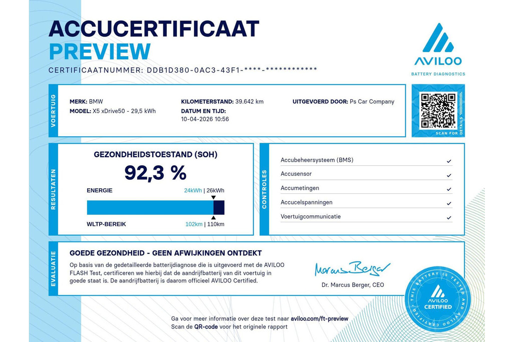 De state of health van de accu is nog 92,3%. Bij deze X5 geniet u ook van maximale zekerheid dankzij de uitgebreide fabrieksdekkingen: