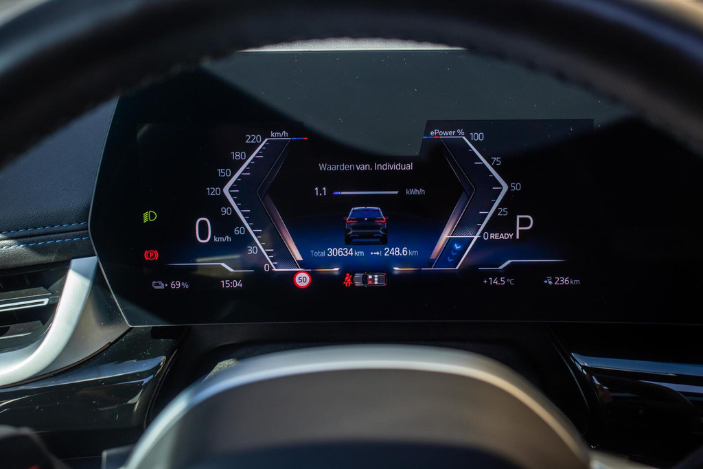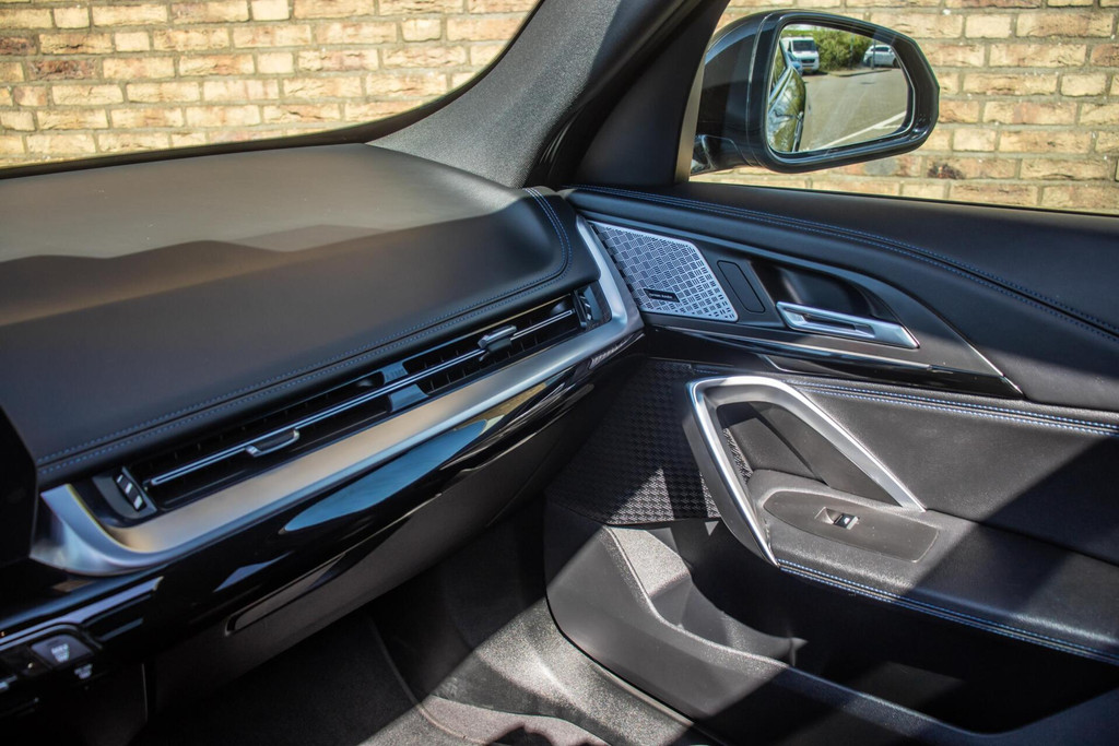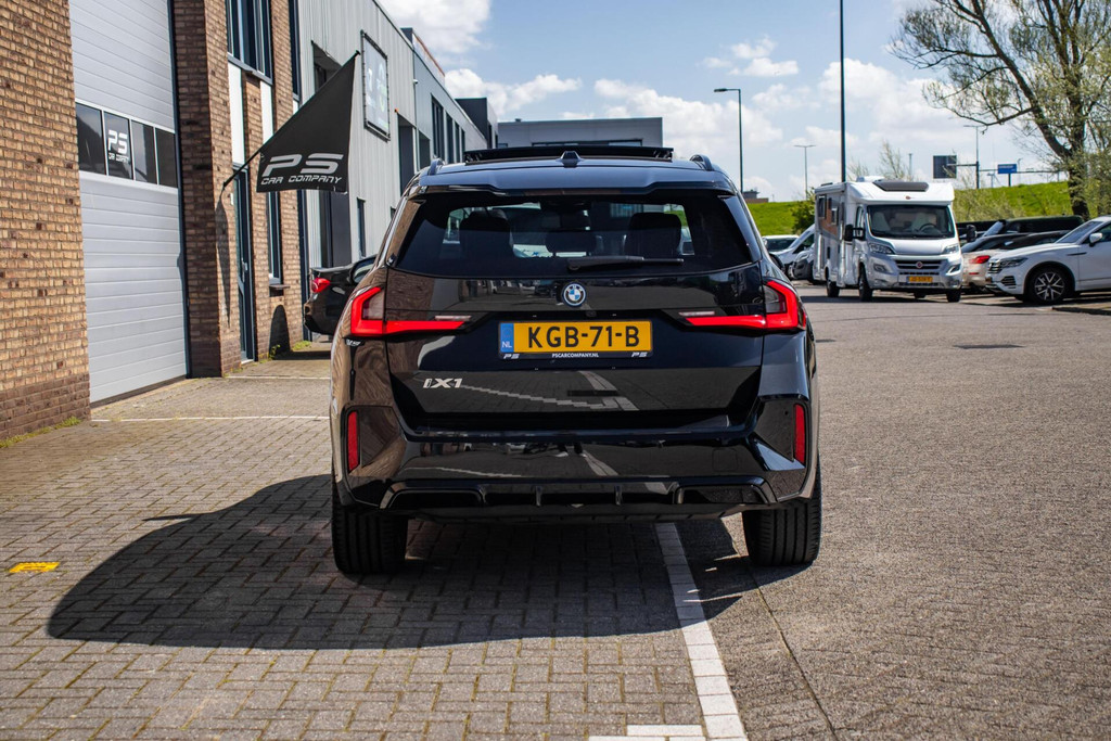 Deze iX1 is uitgevoerd in diepzwart, wat perfect aansluit bij het sportieve M-Sport pakket. De absolute blikvangers zijn de 20 inch BMW Individual velgen, die de auto een exclusieve en krachtige 'stance' geven. Het grote panoramadak zorgt voor een schitterende lichtinval in het interieur en een luxe uitstraling van buitenaf. Voor de nodige praktische inzetbaarheid is de auto tevens voorzien van een trekhaak. Dankzij de aerodynamische lijnen en de moderne BMW-verlichting is dit een EV die overal bewonderende blikken oogst.