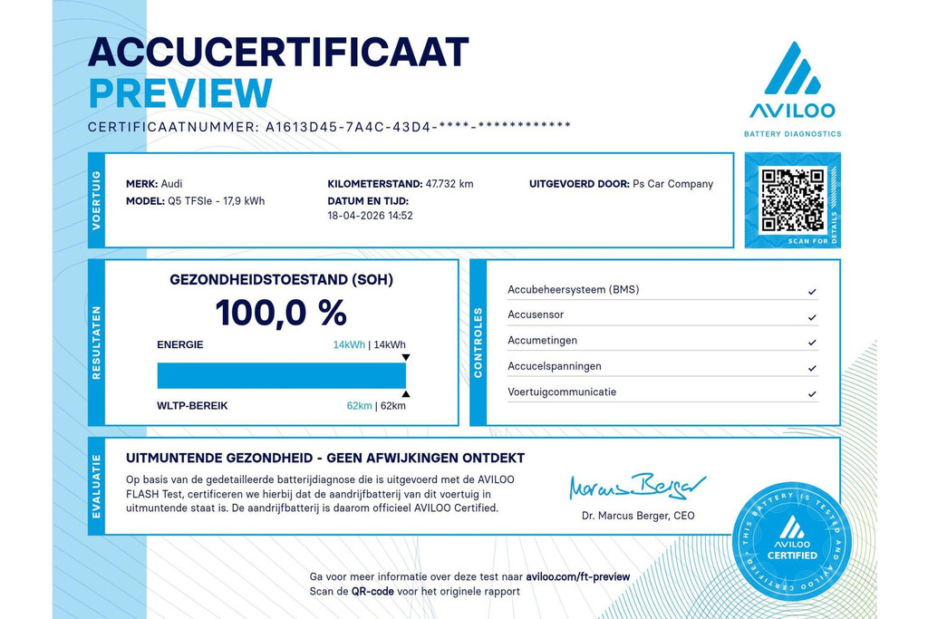 - Accugarantie: Voor de hoogvoltaccu van de hybride-aandrijving is Audi zeer gul. Deze is gedekt tot maar liefst 22 oktober 2030 (of tot maximaal 160.000 km). Dit is een supersterk punt, omdat u hiermee volledig beschermd bent tegen defecten of buitensporig capaciteitsverlies van het accupakket. Overigens is de state of health van de accu nog 100%.
