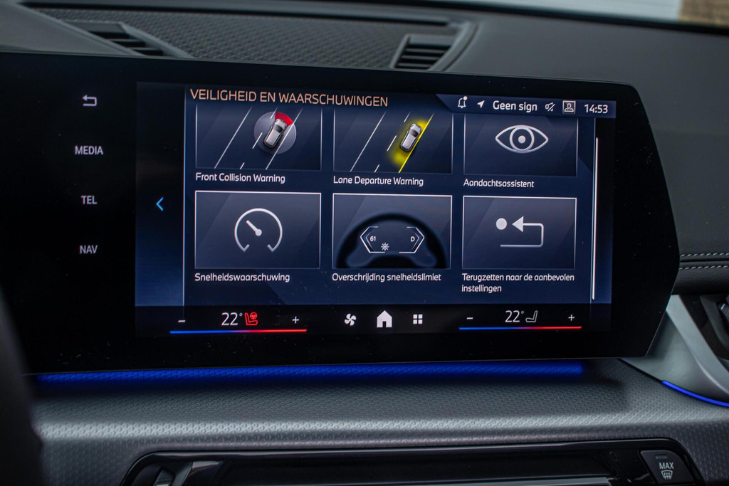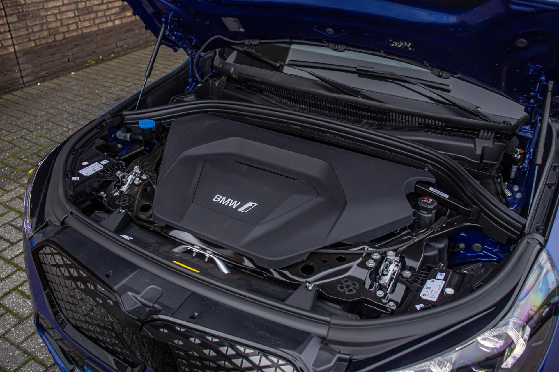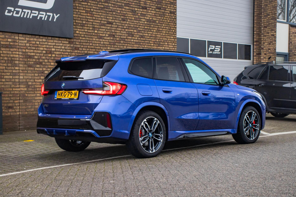 De auto is uitgevoerd in het stijlvolle Portimao Blue, een kleur die perfect past bij het moderne design van de iX1. In combinatie met de 19 inch lichtmetalen wielen krijgt de auto een krachtige en sportieve uitstraling. Het panoramadak maakt het exterieur helemaal af en geeft bovendien een ruimtelijk gevoel in het interieur.