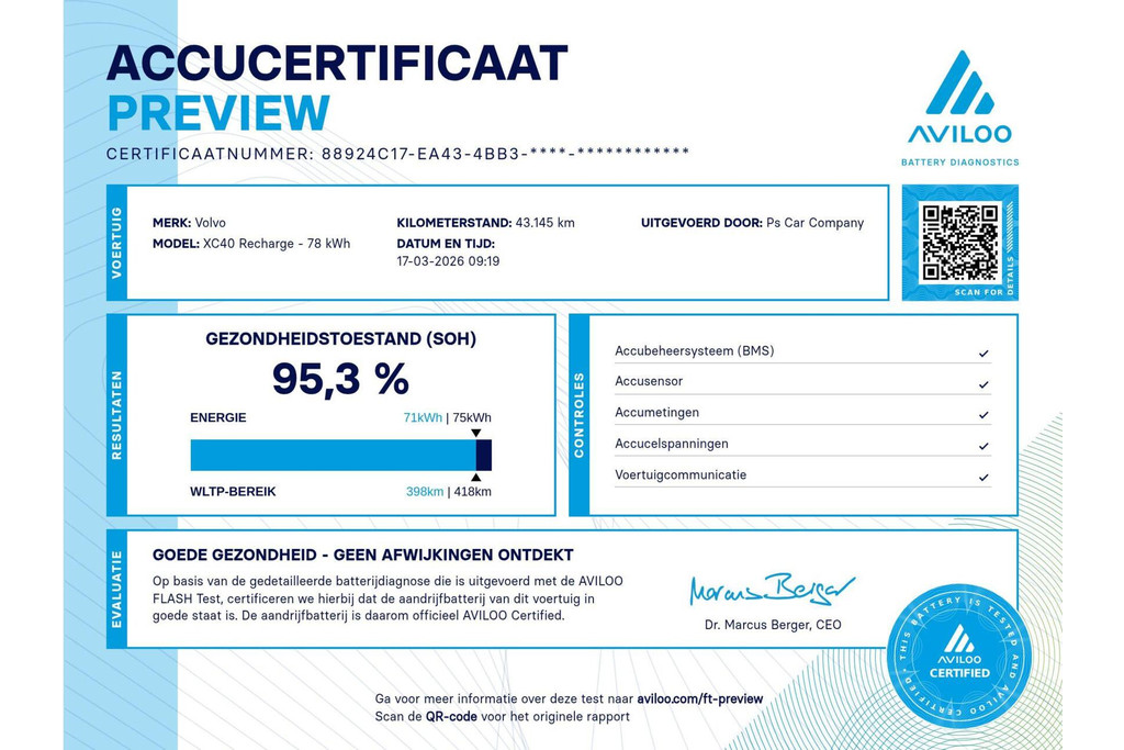 De Volvo heeft slechts één eigenaar gehad en staat op een kilometerstand van 43.128 km. De state of health van de auto is 95,3%. Standaard leveren wij deze auto af met 12 maanden / 12.000 km garantie op de aandrijflijn. Voor extra zekerheid is er tegen meerprijs van €1.000,- ook een BOVAG-garantie mogelijk van 12 maanden / 20.000 km op de volledige auto.