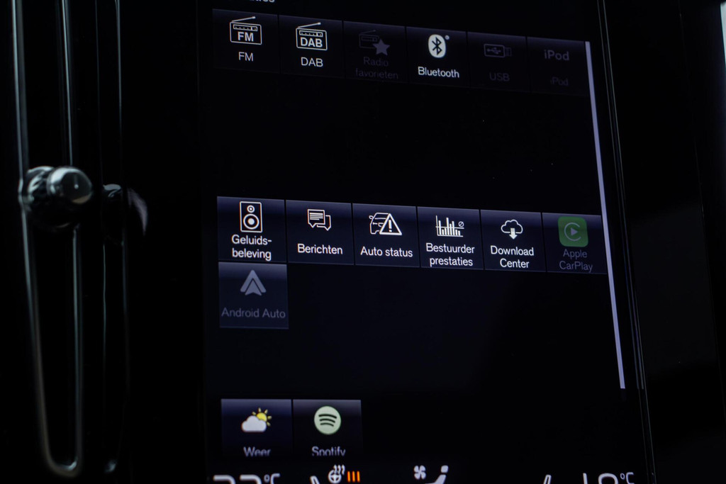 Binnenin valt direct de hoogwaardige afwerking op. Het lederen interieur sluit perfect aan bij het sportieve karakter van de R-Design uitvoering. Zowel de voorstoelen als het stuurwiel zijn verwarmd, wat het comfort in koudere maanden aanzienlijk verhoogt. De elektrisch verstelbare stoelen met memoryfunctie zorgen ervoor dat altijd snel de ideale zitpositie wordt gevonden. Dankzij het panoramadak oogt het interieur ruim en licht. Het Harman Kardon audiosysteem staat garant voor een krachtige en heldere geluidsbeleving, terwijl Apple CarPlay zorgt voor naadloze smartphone-integratie.