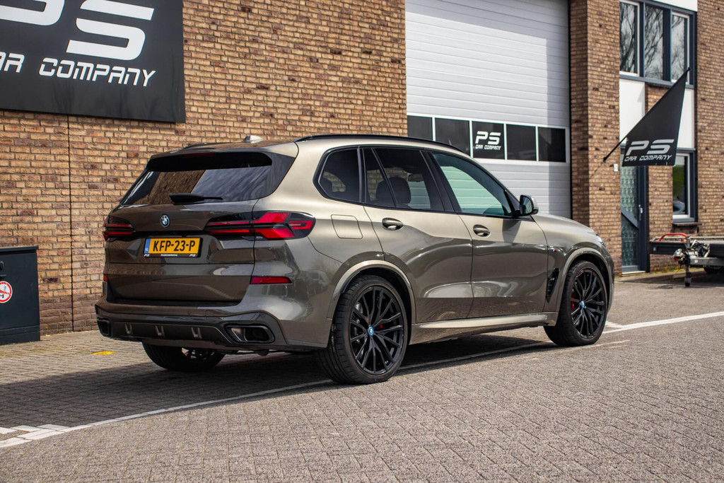 De uitstraling van deze X5 is uniek te noemen. De auto is gespoten in de exclusieve kleur Manhattan Metallic, een tint die kracht en elegantie perfect combineert. Het M-Sport pakket en de imposante 22 inch velgen geven de auto een onmiskenbare 'presence' op de weg. Een bijzonder detail is de Sky Lounge panoramadak; in de avonduren wordt het glas verlicht door duizenden LED-punten, wat zorgt voor een magische sfeer. Voor optimaal gebruiksgemak is de auto bovendien voorzien van een elektrisch uitklapbare trekhaak en Soft-Close deuren die zichzelf geruisloos dichttrekken.
