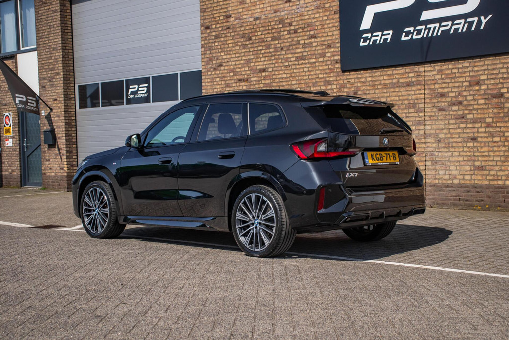 Deze iX1 is uitgevoerd in diepzwart, wat perfect aansluit bij het sportieve M-Sport pakket. De absolute blikvangers zijn de 20 inch BMW Individual velgen, die de auto een exclusieve en krachtige 'stance' geven. Het grote panoramadak zorgt voor een schitterende lichtinval in het interieur en een luxe uitstraling van buitenaf. Voor de nodige praktische inzetbaarheid is de auto tevens voorzien van een trekhaak. Dankzij de aerodynamische lijnen en de moderne BMW-verlichting is dit een EV die overal bewonderende blikken oogst.